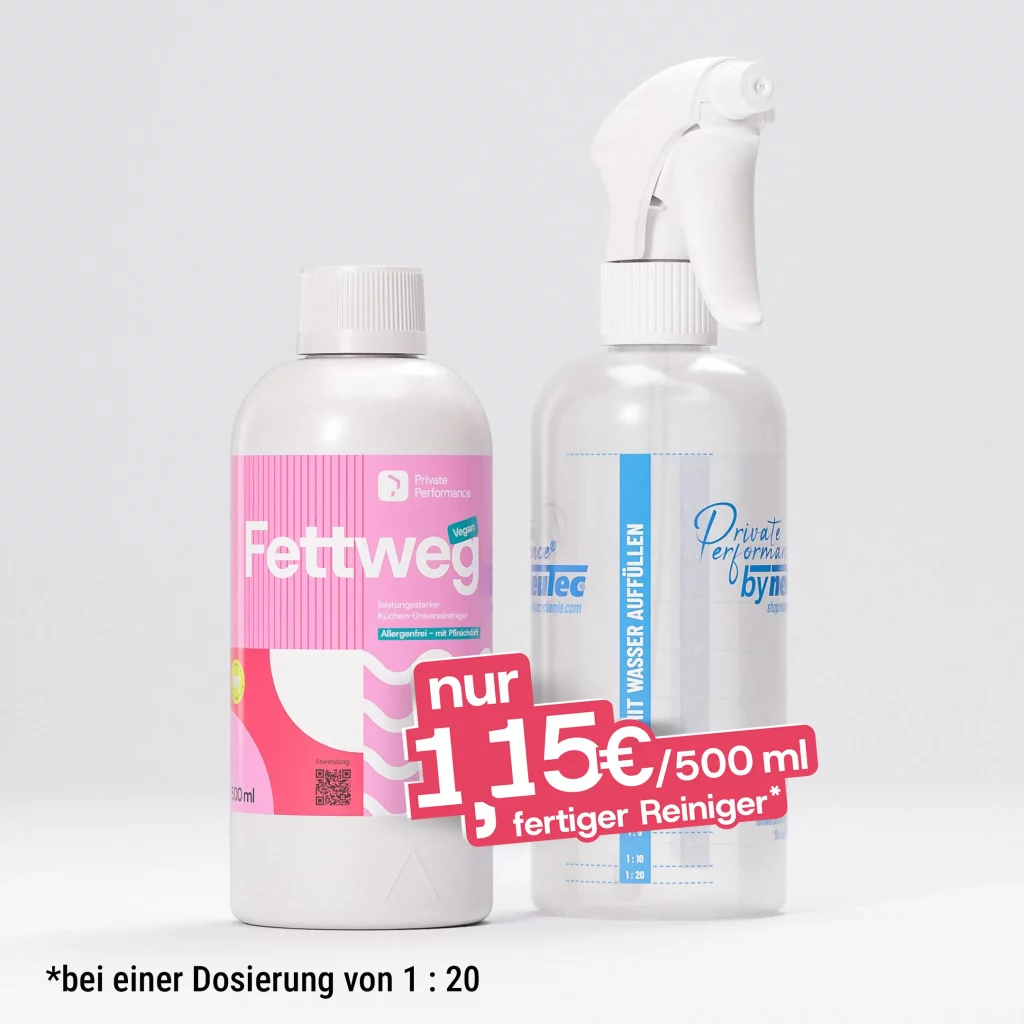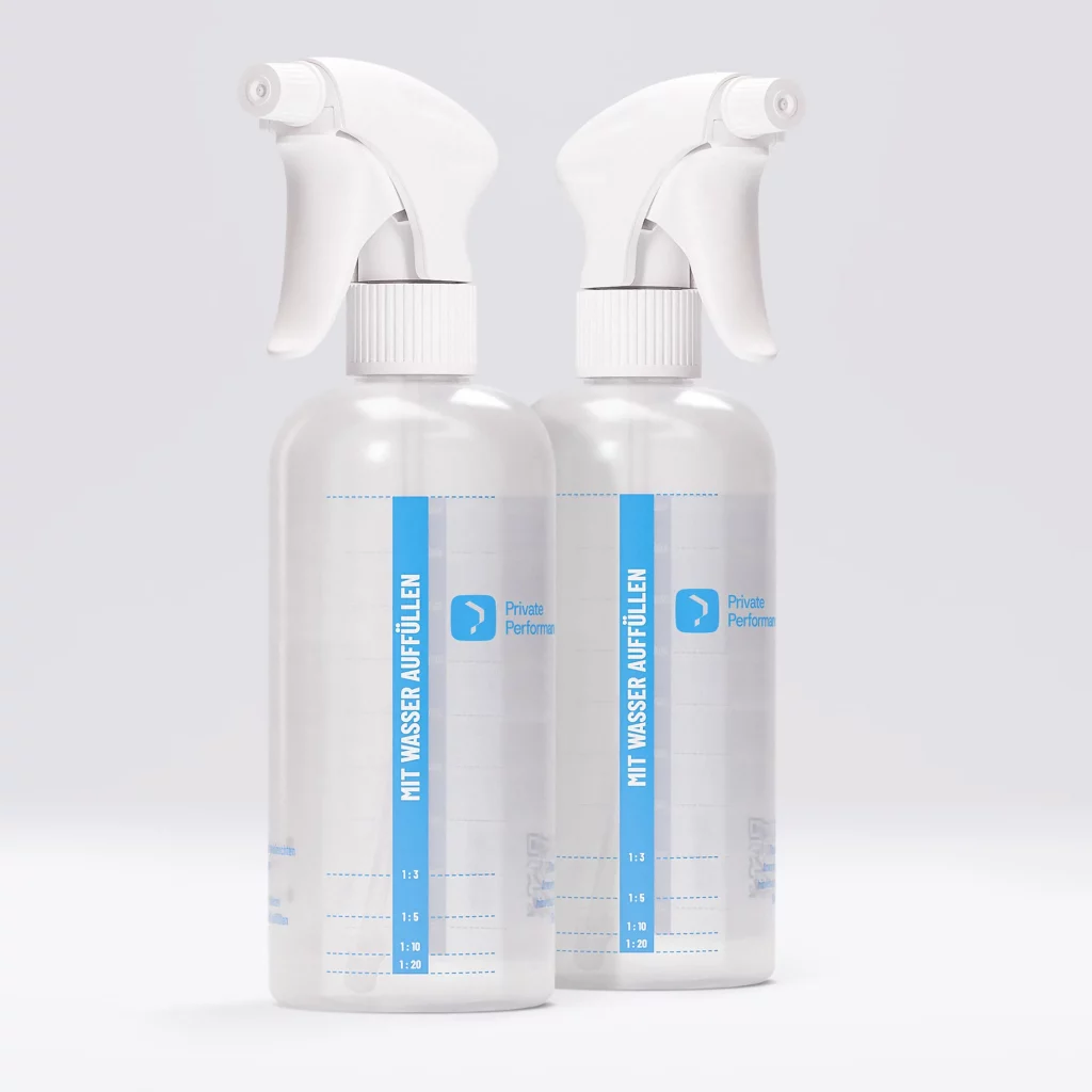 So viel Plastikabfälle verursacht ein deutscher Haushalt im Durchschnitt. Ein Reinigerkonzentrat wie private performance spart 90% Plastik in seinem Bereich ein. Statt zehn Flaschen Reinigern, brauchst du nur noch eine. Diese besteht dann auch noch aus wiederverwendetem Rezyklat.