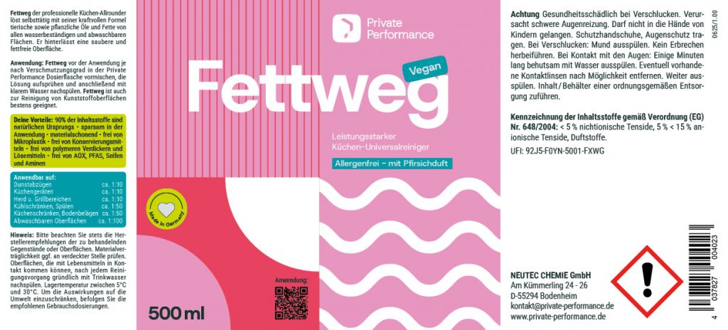 Fettweg zeichnet sich nicht nur durch seine Reinigungskraft aus, sondern auch durch seine nachhaltigen Eigenschaften. Es ist zu 90% aus natürlichen Inhaltsstoffen hergestellt, vegan, frei von Mikroplastik und Konservierungsmitteln sowie polymeren Verdickern, Lösemitteln, AOX, PFAS, Seifen und Aminen. Damit leisten Sie einen Beitrag zum Umweltschutz, ohne Kompromisse bei der Effektivität einzugehen.