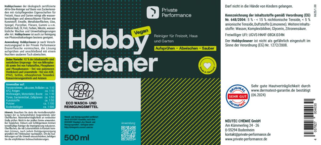 Wer nach einem effektiven Reiniger sucht, der zudem umweltbewusste Ansprüche erfüllt, findet im HOBBYCLEANER den idealen Begleiter. Ideal für Freizeit, Haus und Garten – dieser zertifizierte All-in-One-Reiniger auf Basis von Zuckertensiden sorgt auf eine umweltfreundliche Weise für blitzblanke Sauberkeit und hinterlässt rückgepflegte Oberflächen.