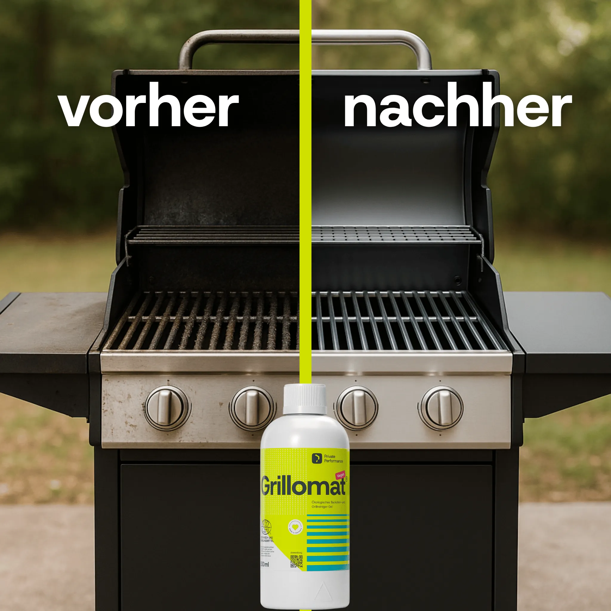GRILLOMAT® bietet eine kraftvolle Reinigungslösung, die selbst die hartnäckigsten Verschmutzungen beseitigt – ohne mühsames Schrubben. Die innovative Gel-Formel haftet perfekt an vertikalen Flächen und löst Fett, Öl, Eiweiß, Ruß und sogar eingebrannte Grillreste.