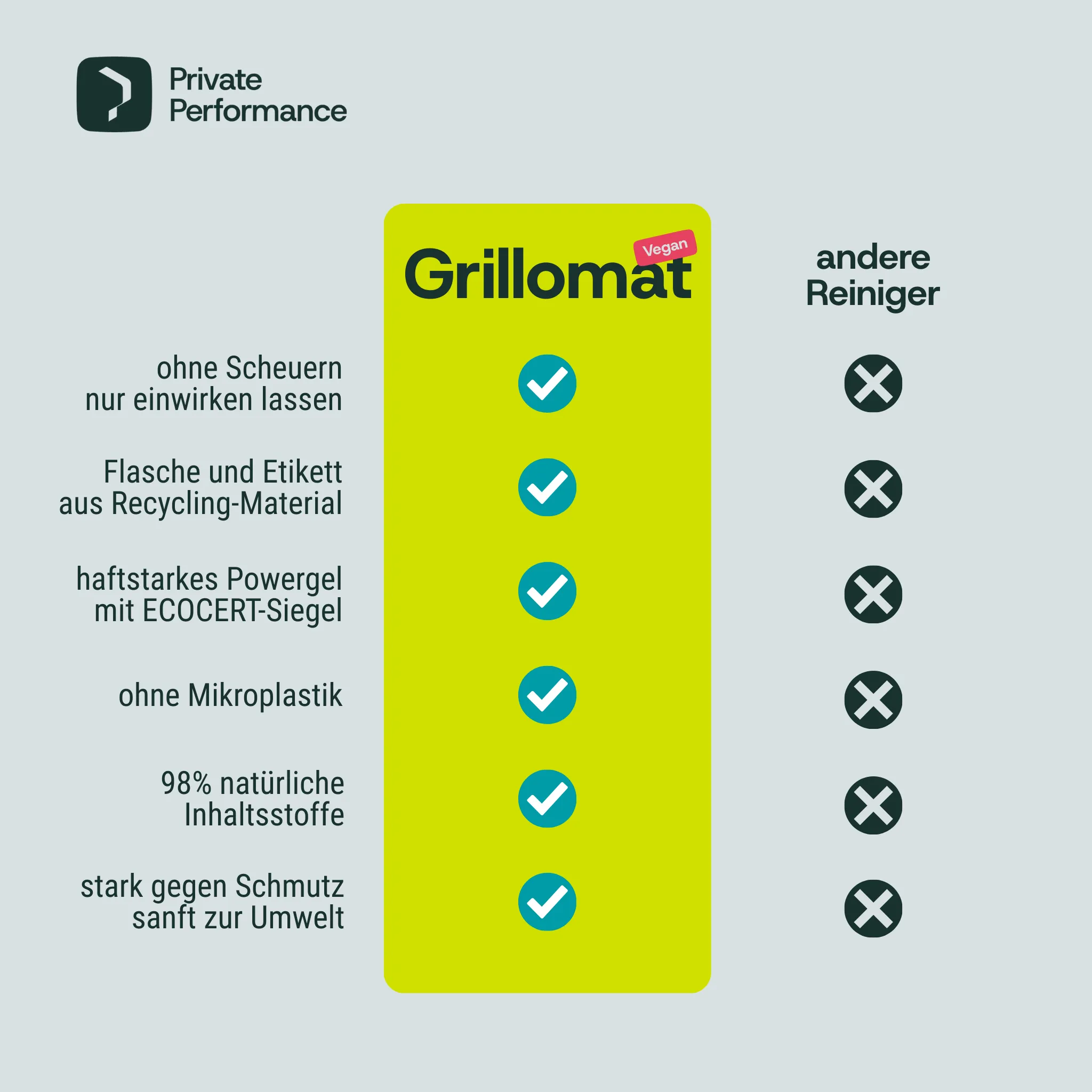 Unser Reiniger besteht zu 98 % aus Inhaltsstoffen natürlichen Ursprungs. Dabei legen wir besonderen Wert auf Nachhaltigkeit und den Schutz unserer Umwelt. GRILLOMAT® ist: