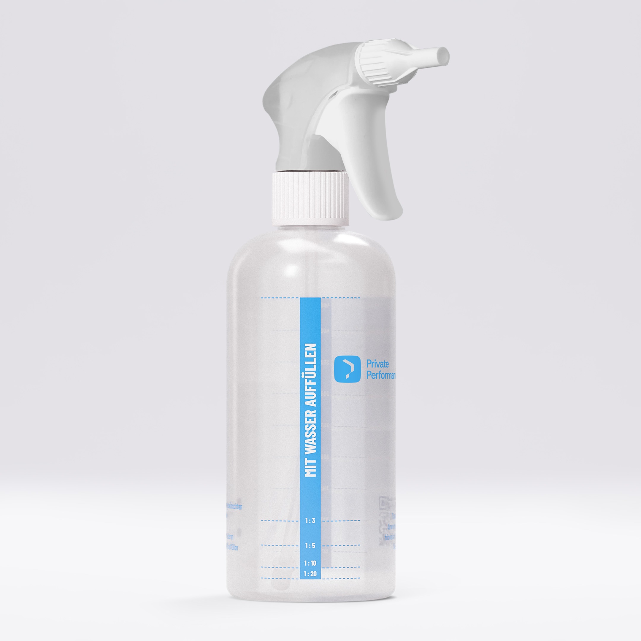 1. Vorbereitung: Je nach Verschmutzungsgrad die Lösung in der Private Performance Dosierflasche mit dem Schaumsprühkopf vorbereiten.